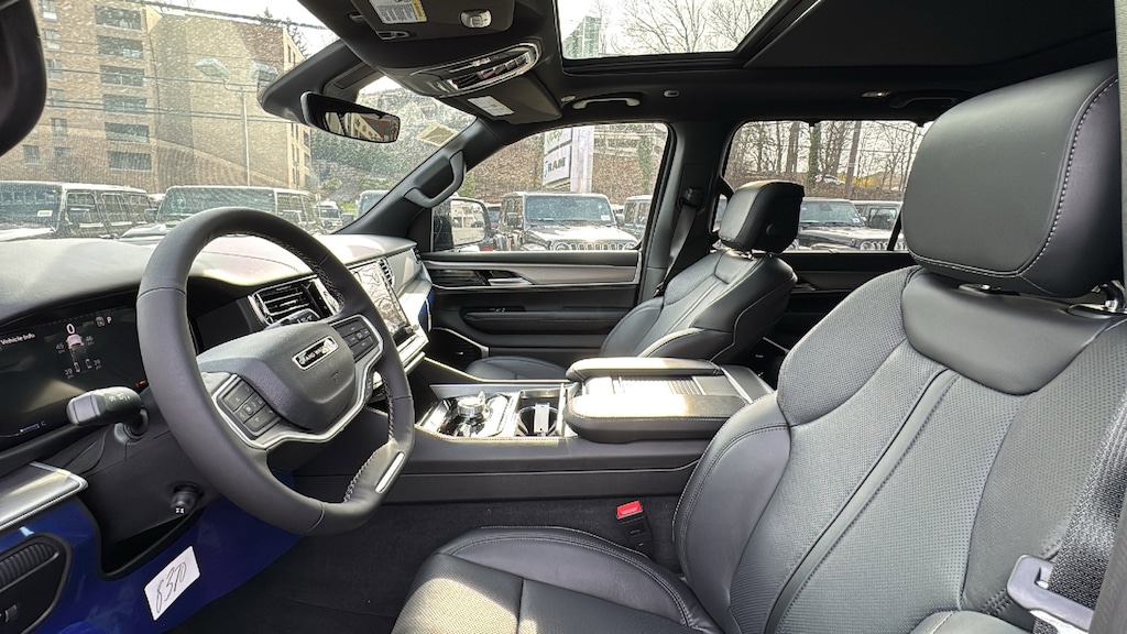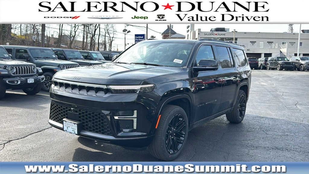 High Gloss Black 2026 Jeep Grand Wagoneer Limited Reserve 4WD 8-Speed Automatic 3.0L I6 118 Mph Maximum Speed Calibration, 19 Speaker McIntosh Audio System, 2nd Row Manual Window Shades, 3 Panel Sunroof, 3.55 Rear Axle Ratio, 3rd row seats: bench, 4-Wheel Disc Brakes, 9 Speakers, ABS brakes, Air Conditioning, Alloy wheels, AM/FM radio: SiriusXM with 360L, Anti-whiplash front head restraints, Apple CarPlay/Android Auto, Audio memory, Augmented HUD, Auto Adjust in Reverse Exterior Mirrors, Auto High-beam Headlights, Auto-dimming door mirrors, Auto-Dimming Exterior Driver Mirror, Auto-dimming Rear-View mirror, Auto-leveling suspension, Automatic temperature control, Black Appearance Package, Black Exterior Accents, Brake assist, Bumpers: body-color, Cargo Cover, Cluster 12 TFT Color Display, Compass, Delay-off headlights, Driver door bin, Driver vanity mirror, Driver's Seat Mounted Armrest, Dual front impact airbags, Dual front side impact airbags, Electronic Stability Control, Emergency communication system: Jeep Connect, Exterior Mirrors Approach Lamps, Exterior Mirrors with Memory, Exterior Mirrors with Supplemental Signals, Exterior Parking Camera Rear, Four wheel independent suspension, Front anti-roll bar, Front Bucket Seats, Front Center Armrest w/Storage, Front dual zone A/C, Front fog lights, Front reading lights, Fully automatic headlights, Garage door transmitter, Heated door mirrors, Heated Exterior Mirrors, Heated front seats, Heated rear seats, Heated steering wheel, Illuminated entry, Instrument Panel, Interior Rear Facing Camera, Knee airbag, Leather Trimmed Bucket Seats, Limited Reserve Package, Low tire pressure warning, Luxury Front and Rear Floor Mats, Memory seat, Navigation System, Normal Duty Suspension, Occupant sensing airbag, Outside temperature display, Overhead airbag, Overhead console, P and P Park and Unpark Assist with Stop System, Panic alarm, Passenger door bin, Passenger seat mounted armrest, Passenger vanity mirror, Power Deployable Running Boards, Power door mirrors, Power driver seat, Power Liftgate, Power passenger seat, Power steering, Power windows, Quadra-Lift Air Suspension, Quick Order Package 29D Reserve, Radio data system, Radio: Uconnect 5 Nav with 12.0 Display, Rain sensing wipers, Rear air conditioning, Rear anti-roll bar, Rear reading lights, Rear seat center armrest, Rear window defroster, Rear window wiper, Reclining 3rd row seat, Remote keyless entry, Reversible Carpet/Vinyl Cargo Mat, Security system, Semi Active Damping, Side Distance Warning, Smartphone as a Key Prep, Speed control, Speed-sensing steering, Speed-Sensitive Wipers, Split folding rear seat, Steering wheel memory, Steering wheel mounted audio controls, Surround View Camera System, Tachometer, Telescoping steering wheel, Tilt steering wheel, Titanium Daylight Opening Upper, Titanium Upper Grille Applique, Traction control, Trip computer, Turn signal indicator mirrors, Variably intermittent wipers, Ventilated front seats, Ventilated rear seats, Voltmeter, Wheels: 20 x 9 Aluminum Painted, Wheels: 22 x 9 Painted Gloss Black.Family owned and operated: Salerno Duane is a neighborhood store that has been in business for over 35 years. Hundreds of new and preowned vehicles in stock. Buying a car shouldn't feel like a chore. We know how to make it easy and fun. We thrive on our reputation; come in and find out why.
