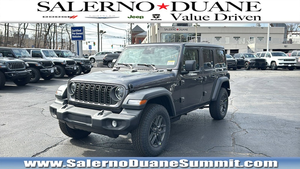 Granite Crystal Metallic Clearcoat 2026 Jeep Wrangler Sport S 4WD 8-Speed Automatic 3.6L V6 24V VVT 12.3 Touchscreen Display, 2-Door Passive Entry, Front Door Locks, 3.45 Overall Top Gear Ratio, 4-Wheel Disc Brakes, 4G LTE Wi-Fi Hot Spot, 8 Speakers, ABS brakes, Advanced Brake Assist, Air Conditioning, Air Conditioning with Auto Temp Control, Air Filtering, AM/FM radio: SiriusXM with 360L, Apple CarPlay, Apple CarPlay/Android Auto, Auto High Beam Headlamp Control, Automatic Headlamps, Aux Battery, Blind Spot and Cross Path Detection, Brake assist, Cluster 7.0 TFT Color Display, Compass, Connectivity - US/Canada, Convenience Group, Corning Gorilla Glass, Deep Tint Sunscreen Windows, Delay-off headlights, Driver door bin, Driver vanity mirror, Dual front impact airbags, Dual front side impact airbags, Electronic Stability Control, Emergency/Assistance Call, Enhanced Adaptive Cruise Control, For More Info, Call 800-643-2112, Front anti-roll bar, Front Bucket Seats, Front Center Armrest w/Storage, Front fog lights, Front LED Fog Lamps, Front reading lights, Full Speed Forward Collision Warning Plus, Google Android Auto, Heated Front Seats, Heated Steering Wheel, Illuminated entry, Injection Molded Black Rear Bumper, Integrated Center Stack Radio, Integrated roll-over protection, Jeep Trail Rated Kit, LED Headlamp and Fog Lamp Group, LED Premium Reflector Headlamps, LED Taillamps, Low tire pressure warning, MOPAR All-Weather Floor Mats, Non-Lock Fuel Cap Without Discriminator, Normal Duty Suspension, Occupant sensing airbag, Outside temperature display, Overhead airbag, Panic alarm, ParkSense Rear Park Assist System, ParkView Rear Back-Up Camera, Passenger door bin, Passenger vanity mirror, Power Heated Mirrors, Power steering, Power Top Quarter Window Storage Bag, Power windows, Premium Wrapped Steering Wheel, Quick Order Package 24S Sport S, Radio data system, Radio: Uconnect 5 with 12.3 Display, Rear anti-roll bar, Rear reading lights, Rear Window Defroster, Rear Window Wiper/Washer, Remote keyless entry, Removable Rear Quarter Windows, Safety Group, Security Alarm, SiriusXM Radio Service, SiriusXM with 360L, Sky One-Touch Power Top, Speed control, Split folding rear seat, Steering wheel mounted audio controls, Stop-Start Dual Battery System, Sun Visors with Illuminated Vanity Mirrors, Tachometer, Telescoping steering wheel, Tilt steering wheel, Traction control, Trip computer, Universal Garage Door Opener, Variably intermittent wipers, Wheels: 17 x 7.5 Black Steel Styled, Wheels: 17 x 7.5 Gray. Not all customers qualify for all incentives. See Dealer for details. Price includes: $1000 - 2026 National Retail Bonus Cash . Exp. 04/30/2026Family owned and operated: Salerno Duane is a neighborhood store that has been in business for over 35 years. Hundreds of new and preowned vehicles in stock. Buying a car shouldn't feel like a chore. We know how to make it easy and fun. We thrive on our reputation; come in and find out why.