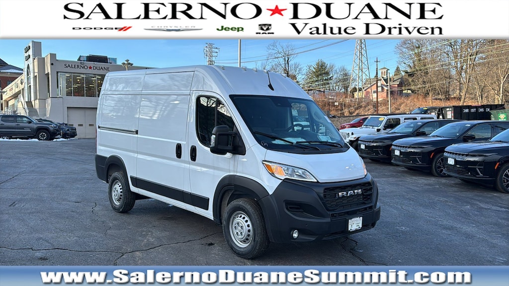 Bright White Clearcoat 2025 Ram ProMaster 1500 FWD 9-Speed 948TE Automatic 3.6L V6 24V VVT 10.1 Touchscreen Display, 4 Speakers, 4-Way Manual Adjust Front Passenger Seat, 4-Wheel Disc Brakes, 4.08 Axle Ratio, 4G LTE Wi-Fi Hotspot, ABS brakes, Adaptive Cruise Control w/Stop & Go, Air Conditioning, AM/FM radio: SiriusXM, Apple CarPlay, Apple CarPlay/Android Auto, Black/Gray Seats, Blind Spot & Cross Path Detection, Bodyside moldings, Brake assist, Cloth Bucket Seats, Connected Travel & Traffic Services, Connectivity - US/Canada, Digital Rearview Mirror w/Autodim, Disassociated Touchscreen Display, Driver door bin, Driver Seat Armrest, Driver's Seat Mounted Armrest, Electronic Stability Control, Exterior Mirrors w/Supplemental Signals, For Details, Visit DriveUconnect.com, For More Info, Call 800-643-2112, Front anti-roll bar, Front Bucket Seats, Front License Plate Bracket, Front reading lights, Front wheel independent suspension, Global Telematics Box Module (TBM), Google Android Auto, GPS Antenna Input, GPS Navigation, HD Radio, Illuminated entry, Integrated Center Stack Radio, Integrated Voice Command w/Bluetooth, Intelligent Speed Assist (ISA), Lane Departure Warning Plus, Low tire pressure warning, Manufacturer's Statement of Origin, Medium Duty Suspension, MOPAR Cargo Area LED Lighting, Outside temperature display, Overhead airbag, Overhead console, ParkSense Front/Rear Park Assist System, ParkView Rear Back-Up Camera, Passenger Bucket Seat, Passenger door bin, Passive Entry, Power steering, Power windows, Premium Convenience Group, Quick Order Package 22B Tradesman w/Pass Seat, Radio: Uconnect 5 Nav w/10.1 Display, Radio: Uconnect 5 w/7 Display, Remote keyless entry, Safety Group, SiriusXM Radio Service, SiriusXM w/360L, Steering wheel mounted audio controls, Tachometer, Telescoping steering wheel, Traction control, Traffic Sign Information, Trip computer, Turn signal indicator mirrors, Variably intermittent wipers, Wheel Center Cap, Wheels: 16 x 6.0 Steel, Wireless Charging Pad, Wood Floor. Not all customers qualify for all incentives. See Dealer for details. Price includes: $5000 - 2025 National Bonus Cash . Exp. 03/31/2026Family owned and operated: Salerno Duane is a neighborhood store that has been in business for over 35 years. Hundreds of new and preowned vehicles in stock. Buying a car shouldn't feel like a chore. We know how to make it easy and fun. We thrive on our reputation; come in and find out why.